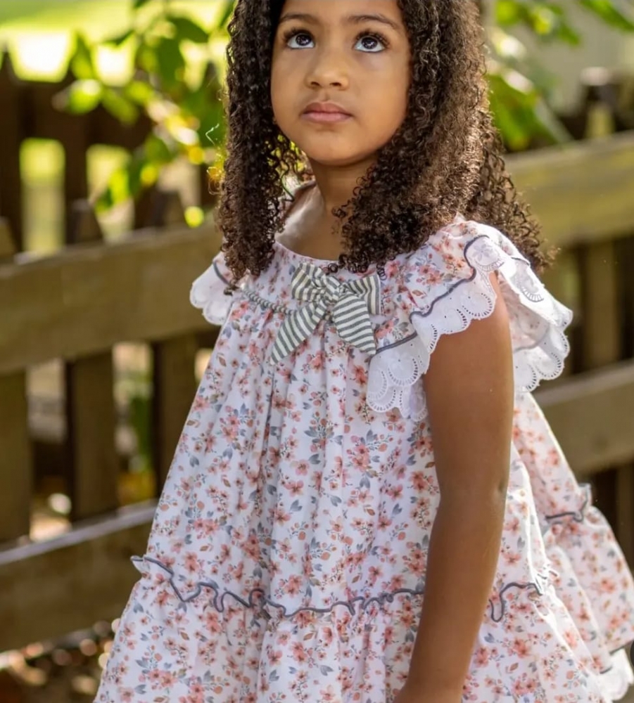 Jesusito de flores y rayas con volantes y puntilla en terminación y en hombros , lazada decorativa en el pecho , braguita de rayas a juego