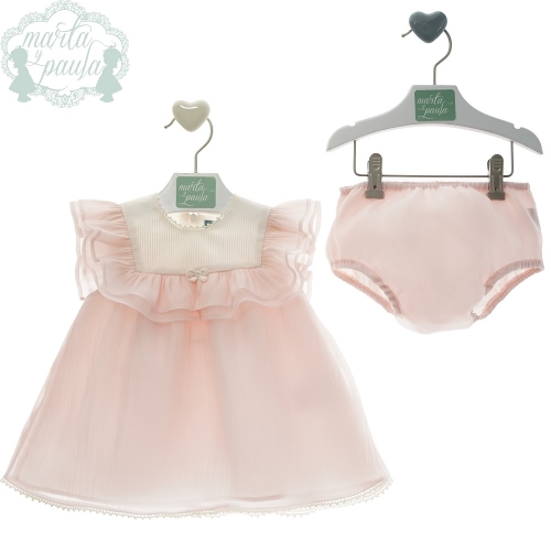 Vestido rosa empolvado con corte canesú a contraste en blanco roto , volantes en el pecho y braguita a juego