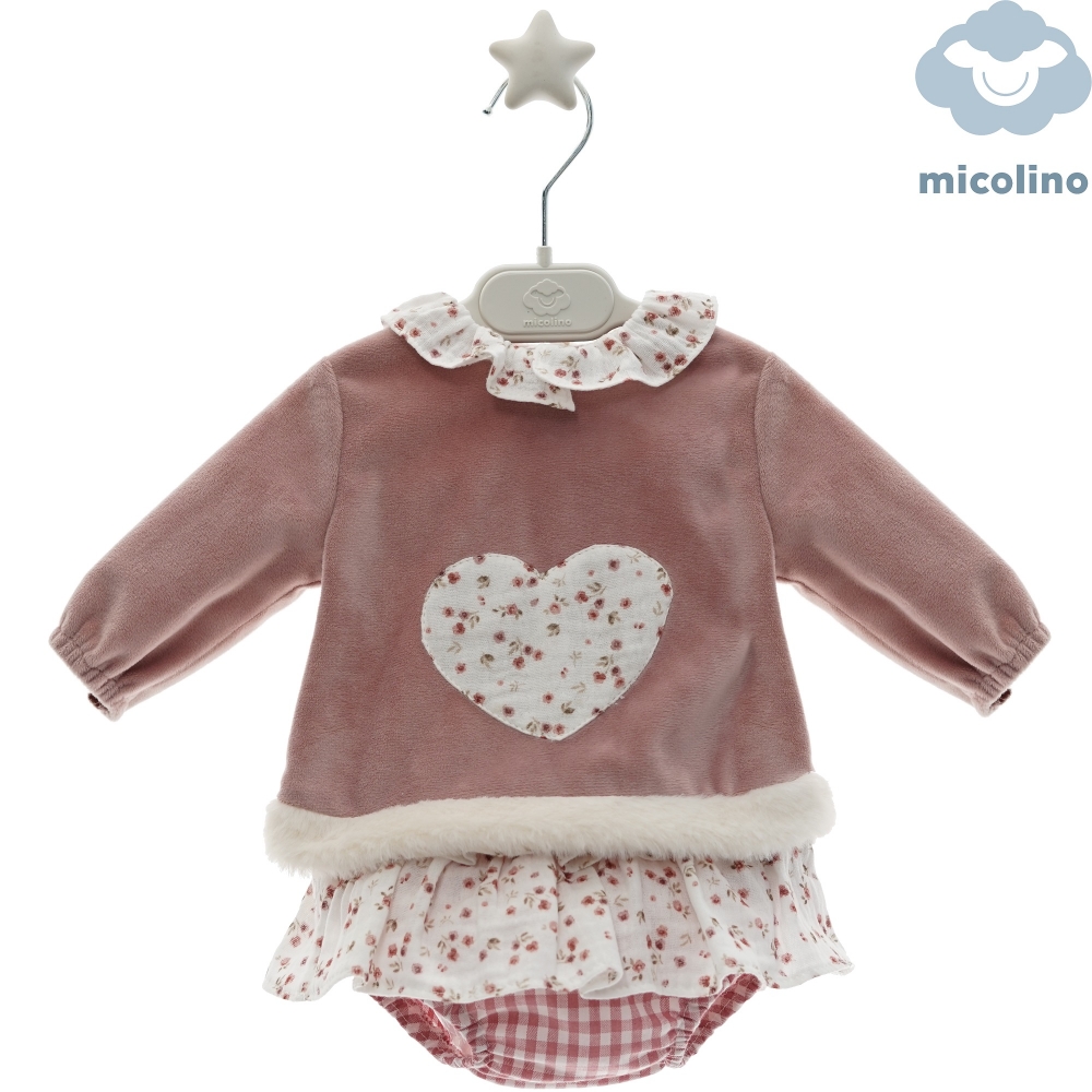 Jersey de terciopelo con cuello de florecitas y corazón e el pecho , braguita de cuadro vichy con volante de florecitas