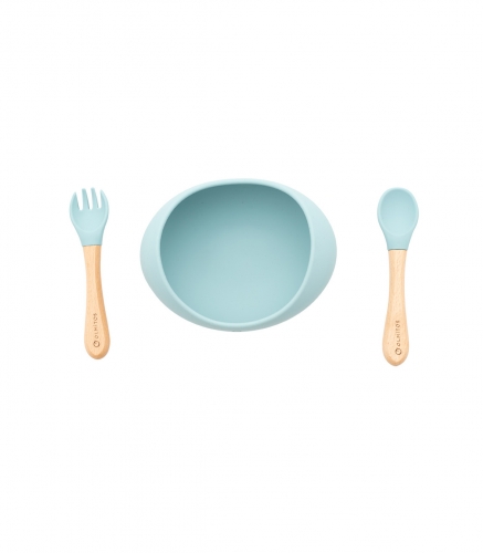 Cuenco en silicona y cubiertos en madera natural y silicona, cuenco con agarre de silicona en la base para no derramar los alimentos el niño