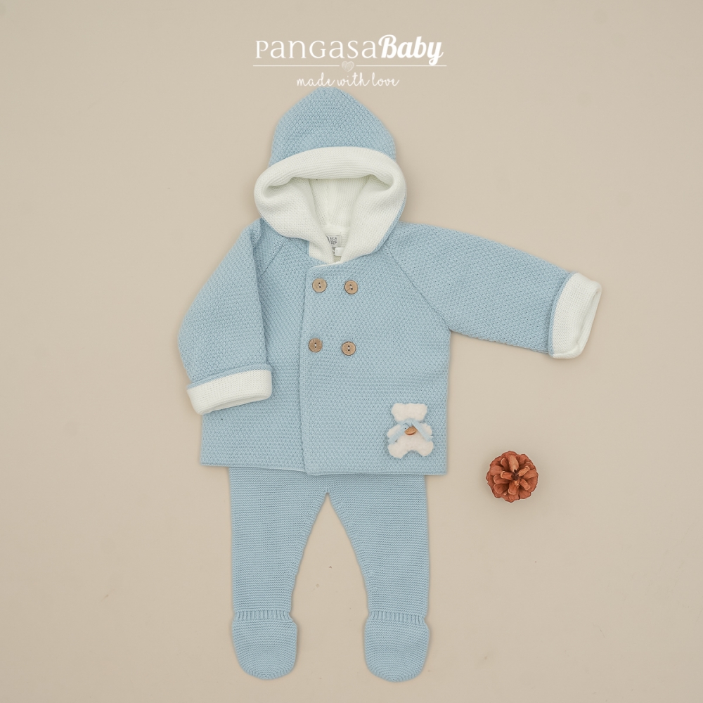 Jersey con doble capa  con capucha , exterior azul , interior nata, osito decorativo de borreguito, polaina a juego