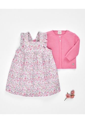 Vestido para bebé niña con estampado de flores o liberty en tonos rosados. Escote cuadrado y volantes en tirantes. Cierre trasero con lazada. Su corte fluido permite una gran libertad de movimiento, haciendo que sea una opción cómoda para cualquier ocasión, ya sea para eventos especiales o para diario.