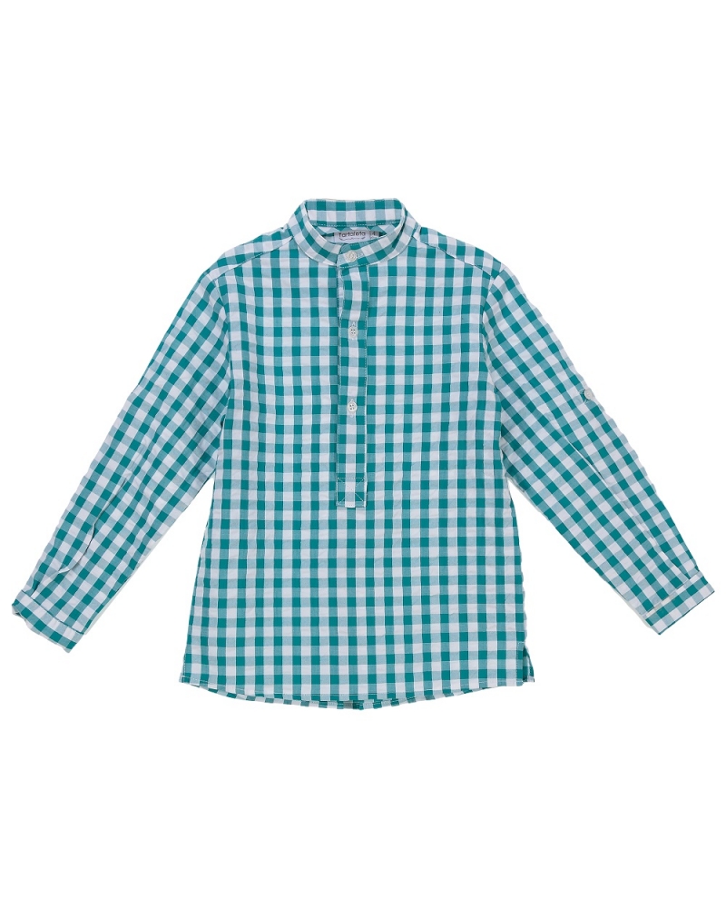 Camisa de cuadros vichy , cuello mao, abotonada hasta la mitad