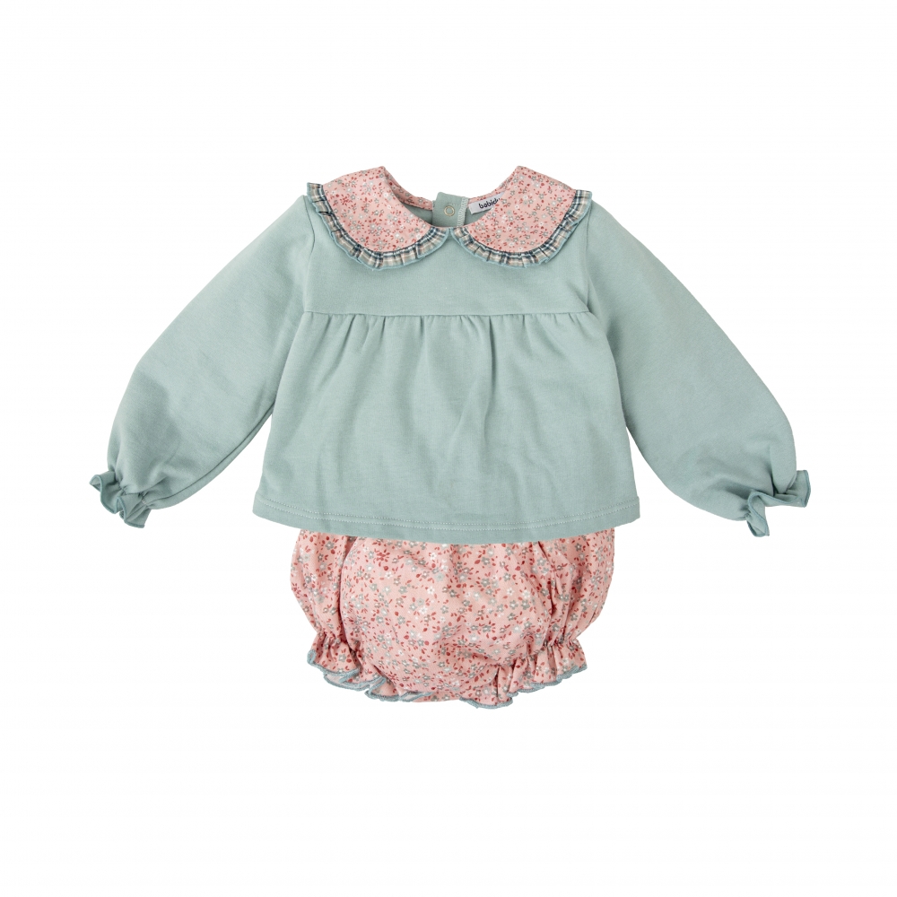 Jersey de algodón con cuellos de tela con flores y braguita de tela de flores a juego
