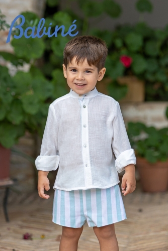 Camisa cuello mao , en el interior del cuello de rayas y en la parte del interior de los botones y en puños, pantón corto de rayas verde agua abotonado en los laterales