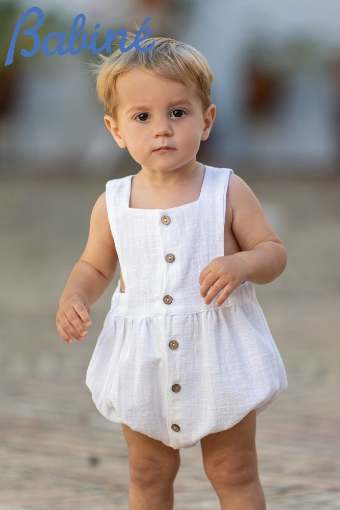 Pelele blanco con botones de madera en el frontal hasta abajo y en la entre pierna, goma en cintura y piernas, muy cómodo , veraniego y versatil
