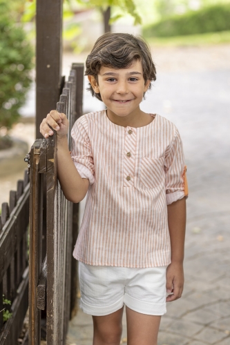 Camisa liberty naranja con manga ,abotonada en el pecho hasta la mitad