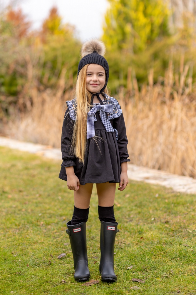 Jesusito con cuellos grandes y lazada en cuadros negros y flores, corte canesú y braguita a juego de flores