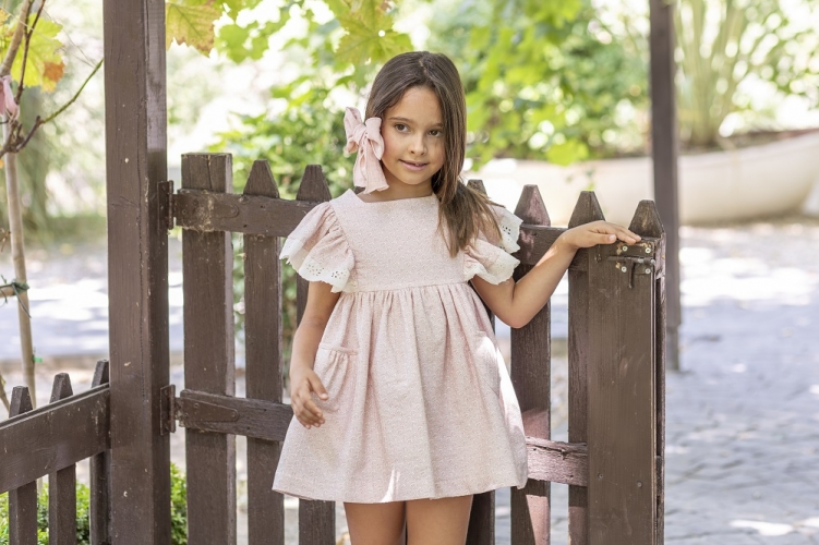 Vestido con manga caidas y volantes y puntilla y bolsillos delanteros