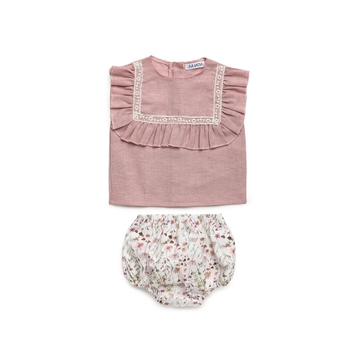 Conjunto de camisa y braga de la colección 'Siroco' para bebés y niños, una línea dulce y encantadora que destaca por su color rosa maquillaje y sus delicados estampados de florecitas. Confeccionada con amor en España, cada prenda de esta colección combina suavidad y estilo, creando un look perfecto para la primavera-verano. 'Siroco' está diseñada para mantener a los pequeños cómodos y adorables mientras disfrutan de los días cálidos de la temporada.