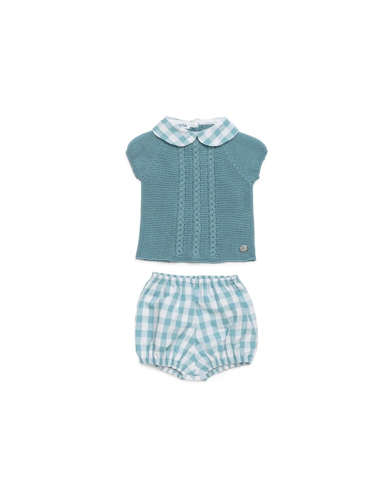 Azul nube , jersey de punto con cuello de tela de cuadros y braguita de tela de cuadros