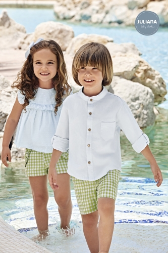 Conjunto de camisa y pantalón corto de la colección 'Ponientada' para bebés y niños, una línea que destaca por la combinación de colores verde lima y celeste , junto con encantadores estampados de cuadritos y anclas. Confeccionada con amor en España, cada prenda de esta colección mezcla armoniosamente tonalidades y texturas, creando un look perfecto para la primavera-verano. 'Ponientada' está diseñada para mantener a los pequeños cómodos y llenos de encanto mientras disfrutan de los días cálidos de la temporada.