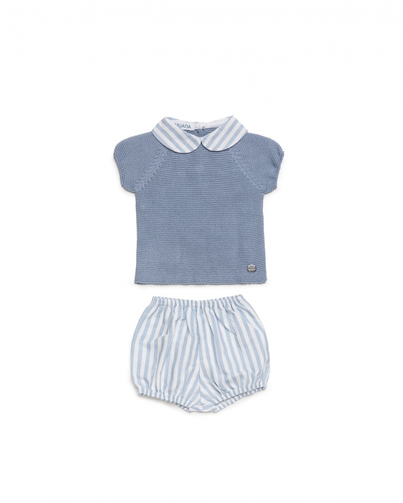 Conjunto de la colección 'Gallego' para bebés y niños, una línea fresca y encantadora que destaca por su color cielo, estampados de rayas y detalles confeccionados en tejido de punto. Confeccionada con amor en España, cada prenda de esta colección combina suavidad y estilo, creando un look perfecto para la primavera-verano. 'Gallego' está diseñada para mantener a los pequeños cómodos y llenos de ternura mientras disfrutan de los días cálidos de la temporada.