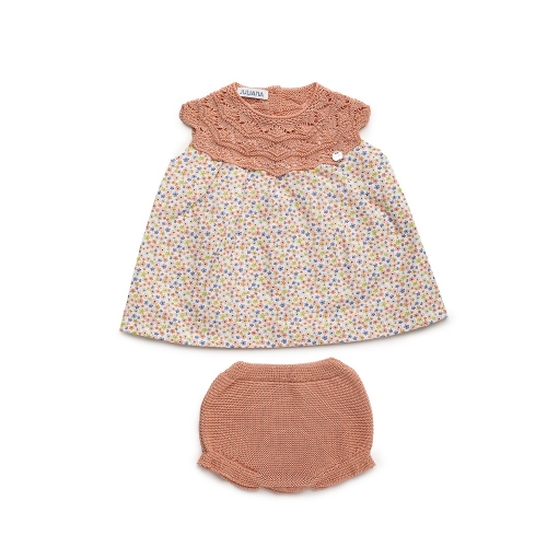 Jesusito con braga de punto de la colección 'Solano' para bebés y niños, una línea dulce y encantadora que destaca por su cálido color salmón y sus delicados estampados de flores. Confeccionada con amor en España, cada prenda de esta colección combina frescura y estilo, creando un look perfecto para la primavera-verano.