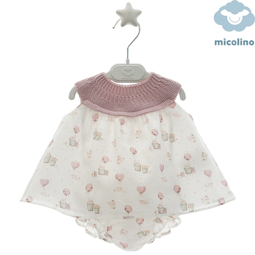 Jesusito con corte cansú en punto, parte de abajo en tela de plumeti con dibujos de conegitos y globos, braguita a juego