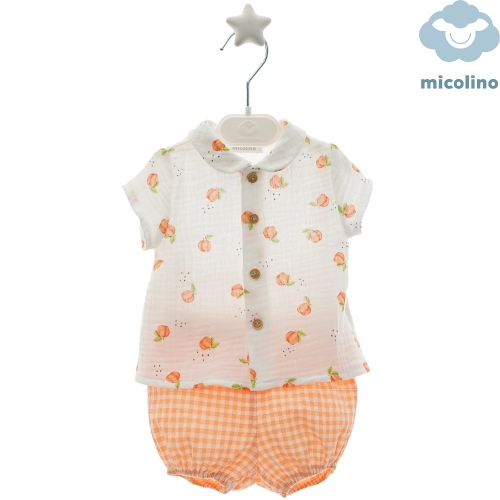 Camisa abotonada adelante con botones de madera , dibujos de mandarinas y cuellos redondos, pantalón corto en cuadros de vichy