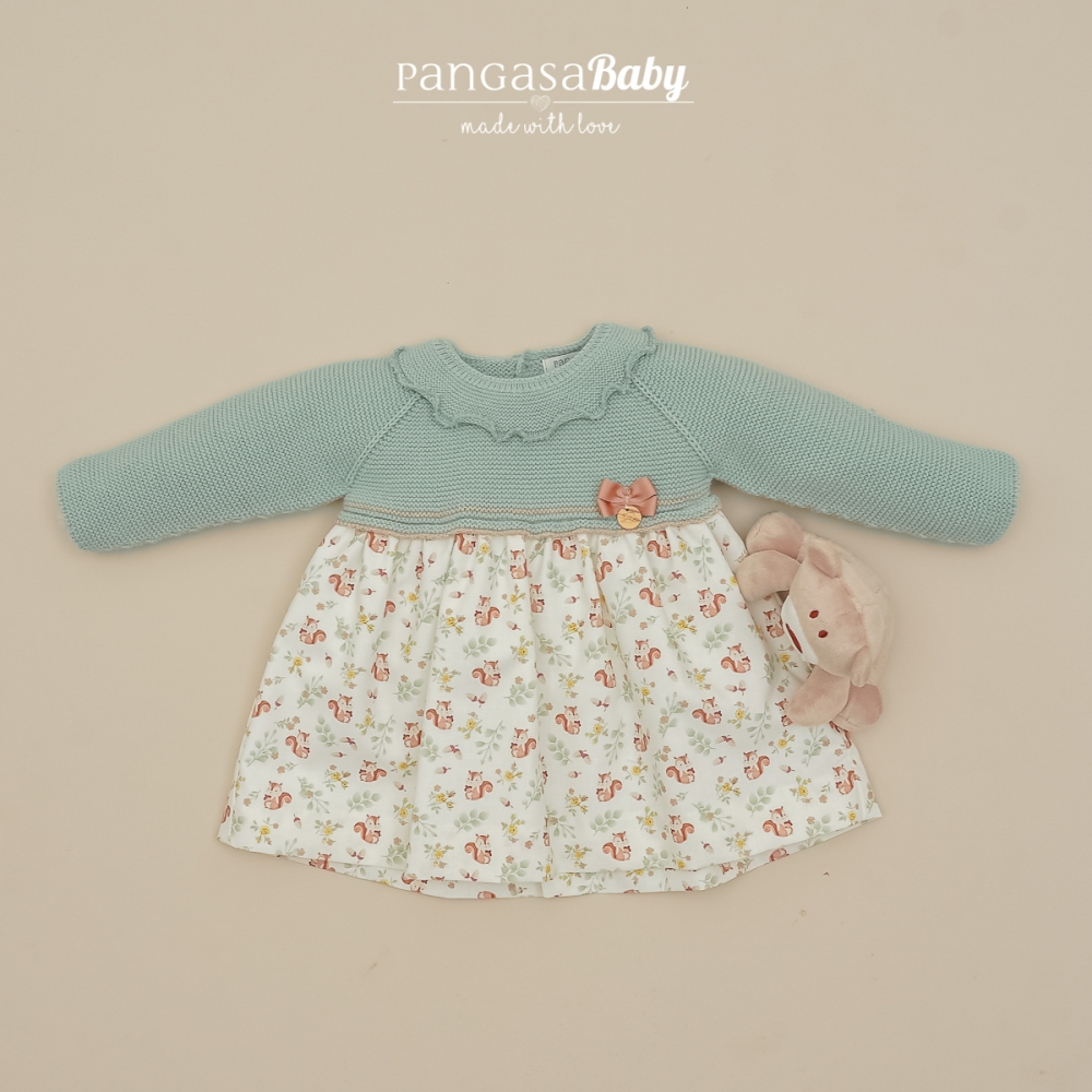 Vestido parte de arriba verde de puto con cuello de volante y lacito decorativo, parte de abajo de tela con dibujos de ardillas