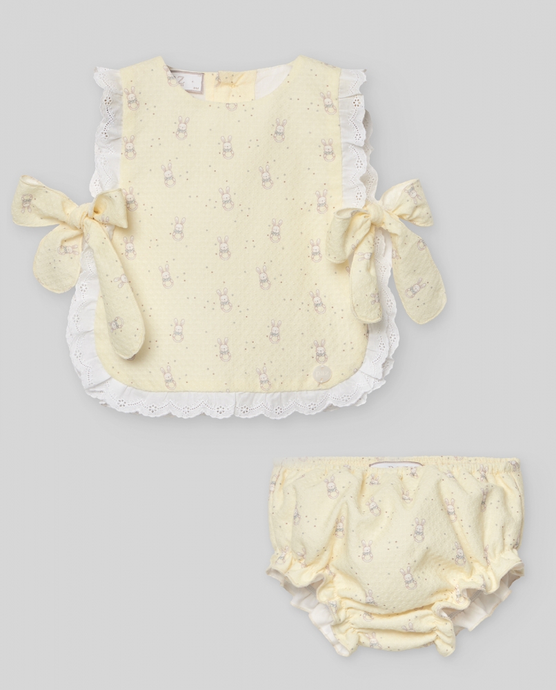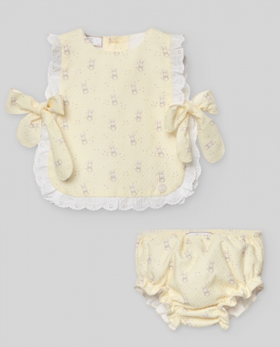 Amarillo, blusón tipo mandil con puntilla al rededor y lazada , braguita a juego