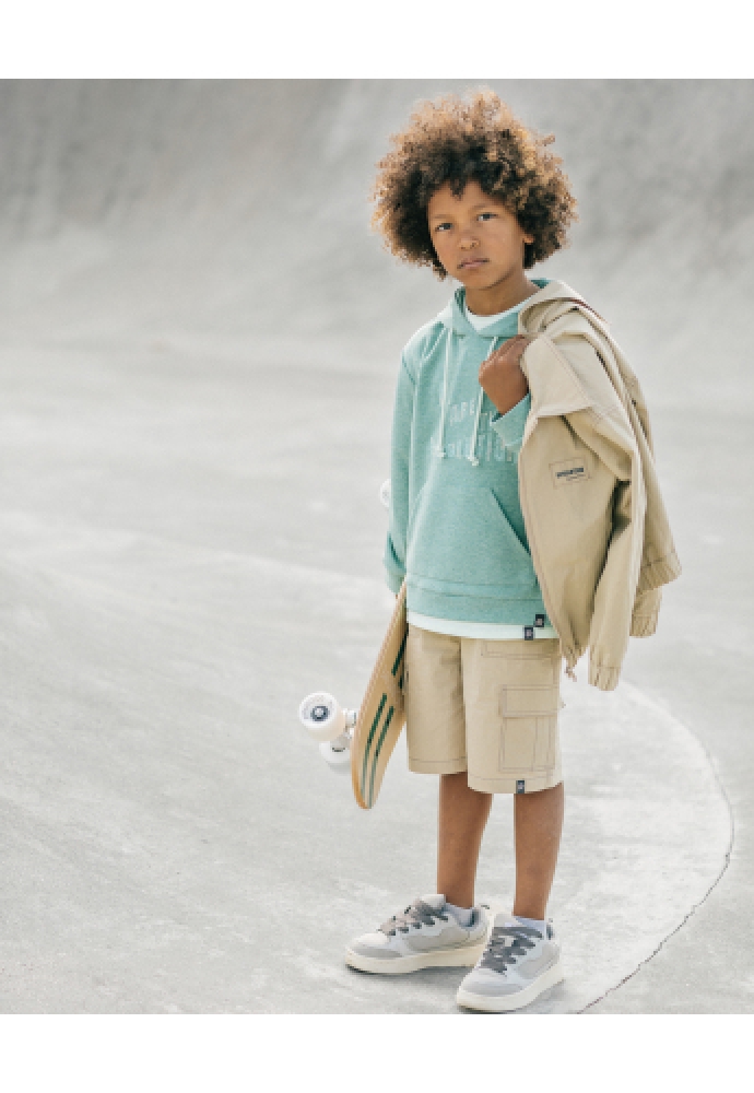 Pantalón lardo rodilla estilo skater multibolsillo. Goma cintura y cordón decorativo.