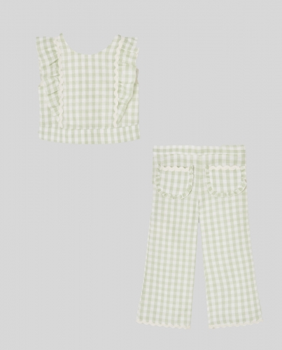 Crudo/Verde oliva, blusa con volante en los laterales, pantalón con bolsillos delanteros , tela en cuadros vichy