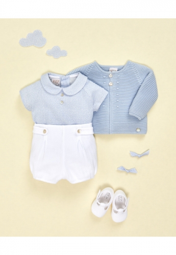 Blusa de bebé con manga ranglan y cuello redondo estampado motitas.Pantalón corto de piqué con goma .
