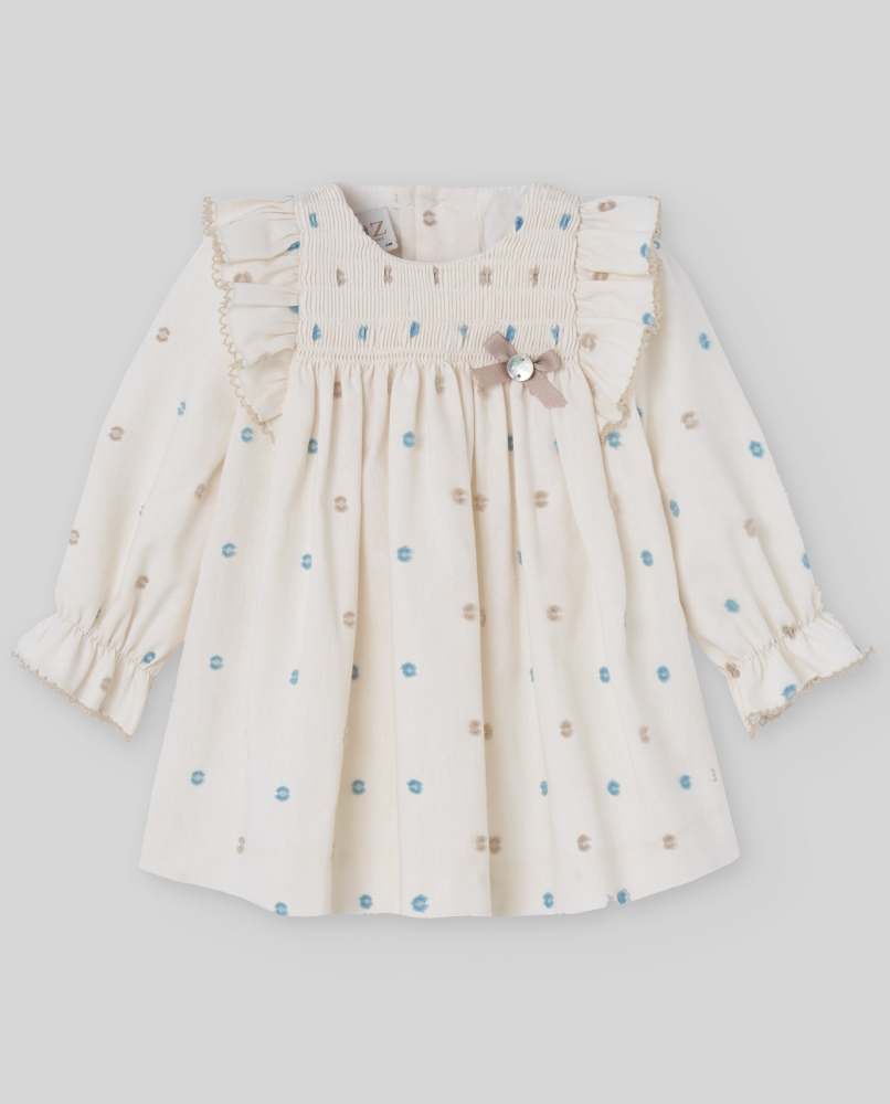 Vestido con fruncido en el pecho y volantes laterales, topitos bordados en dos tonos