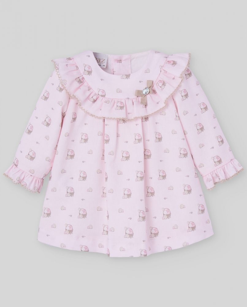 Vestido rosa con puntilla en el canesú y dibujos de cestitas