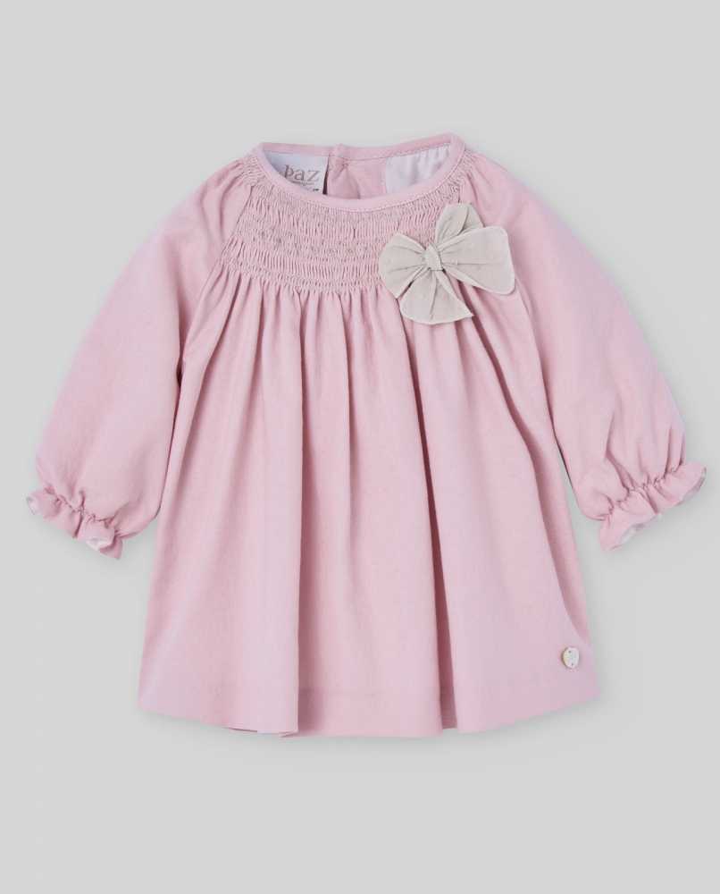 Vestido rosa palo con nido en el pecho y lazo decorativo de plumeti