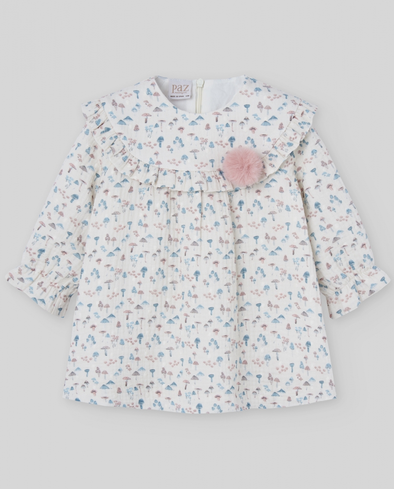 Vestido con dibujos de setas , volante en el canesú y pompón decorativo