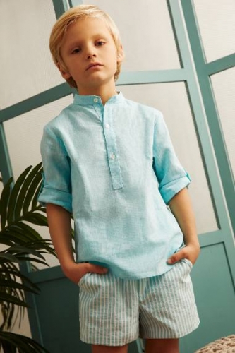 Camisa de lino verde agua sin cuellos abotonada hasta la mitad con botones de madera, pantalón corto de rayas con goma elástica en la cintura en la parte trasera  y dos botones y cremallera en la parte delantera