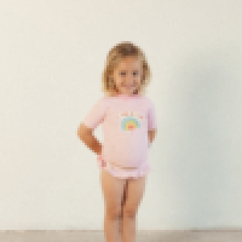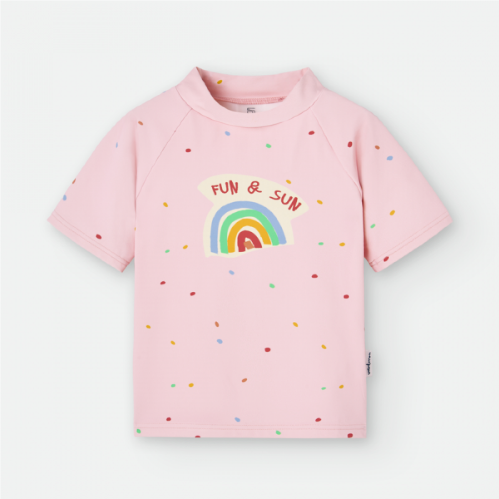 CAMISETA DE BAÑO ESCOTE REDONDO Y MANGA CORTA RANGLAN. ESTAMPADO DE TOPOS Y POSICIONAL DE ARCOÍRIS CON FONDO COLOR ROSA.»