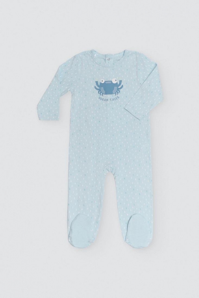 Pelele con pie y manga larga con gotitas y cangrejo serigrafiado, cierre mediante corchetes en la espalda